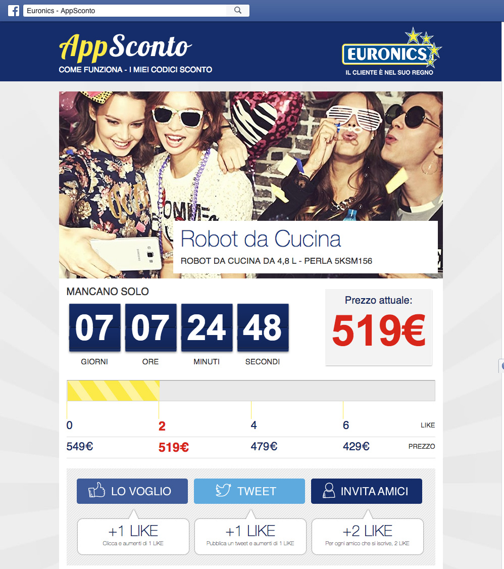 L’applicazione Facebook sconti, per offrire vantaggi ai fan è una applicazione Facebook attivabile sia come tab che come app canvas su una pagina Facebook aziendale. Con questa applicazione i brand possono offrire ai propri fan sconti variabile in base al numero dei richiedenti.
